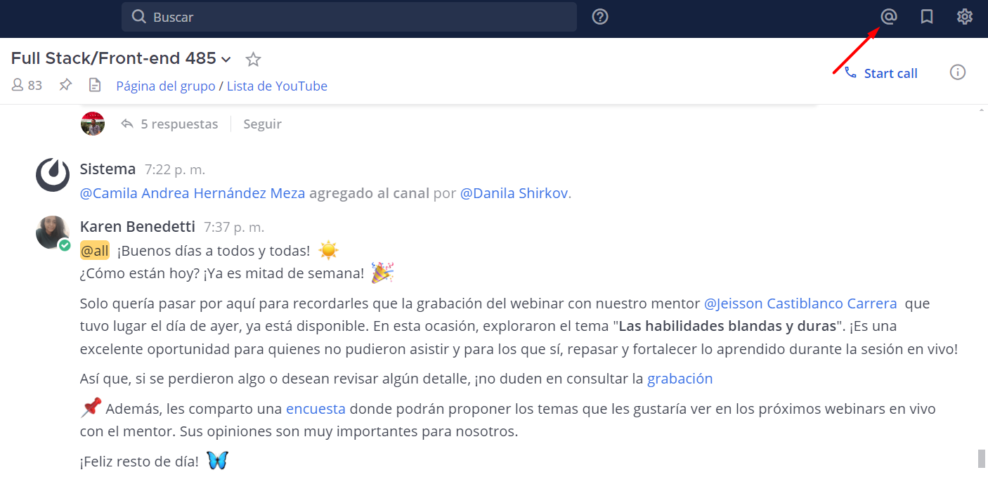Además de las menciones personales, hay menciones generales como @channel y @here, las cuales envían notificaciones a todos los participantes del canal ⚠️ Estas están destinadas a coordinadores y mentores, y no se deben usar por parte de los estudiantes.