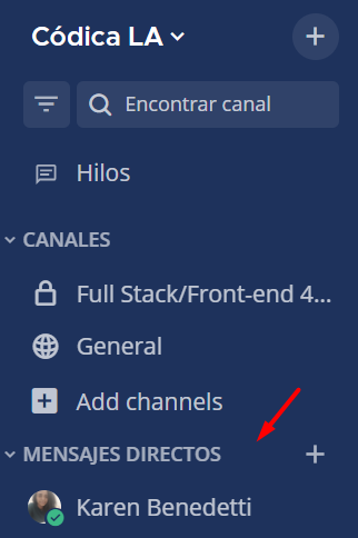 Además de los canales, en Mattermost existen mensajes privados. Puedes necesitarlos para comunicarte con el coordinador del grupo. Los mensajes privados se encuentran en este bloque: