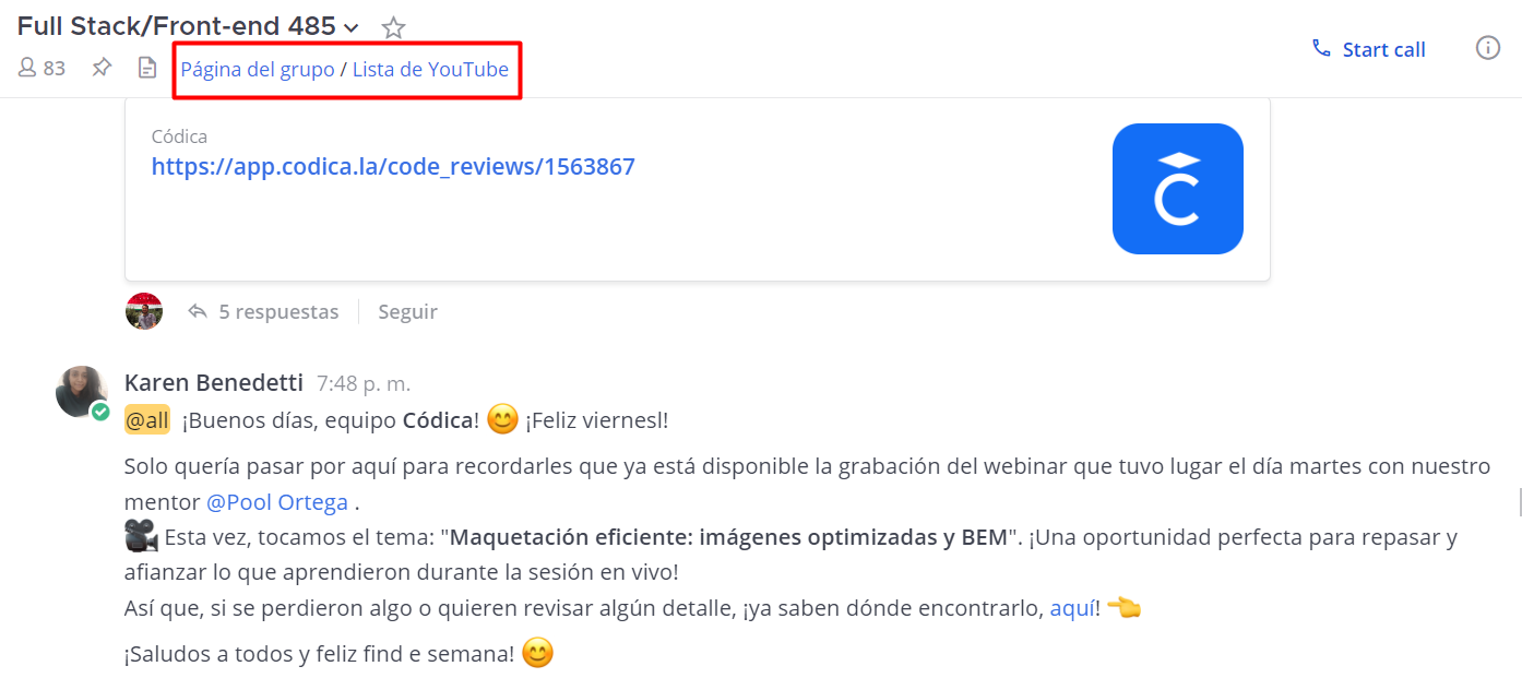 📌 En el canal del grupo, hay un enlace fijo al sitio web de Códica, donde se encuentran todos los materiales importantes para el aprendizaje. Por ejemplo, el calendario de eventos, sus grabaciones, plazos de formación en grupo, entre otros.