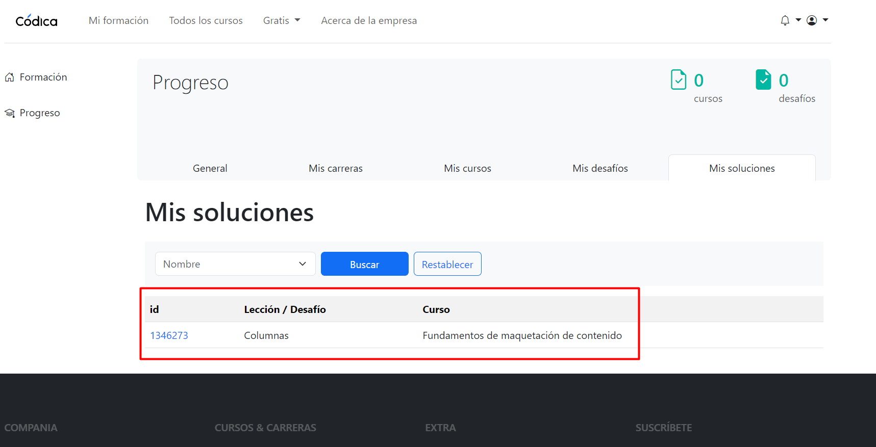 Todas tus soluciones se almacenan en tu panel de control, en la sección «Progreso» → «Mis soluciones».