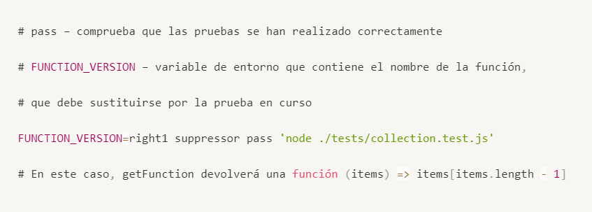El argumento pass indica que Suppressor espera que las pruebas se completen con éxito. El siguiente argumento es el comando que se debe ejecutar. En caso de éxito, se imprimirá el mensaje: